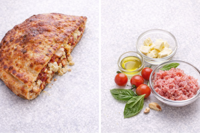 Valmis calzone jaetaan kahteen yhtä suureen annokseen.